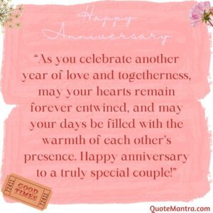 5. “As you celebrate another year of love and togetherness, may your hearts remain forever entwined, and may your days be filled with the warmth of each other’s presence. Happy anniversary to a truly special couple!”